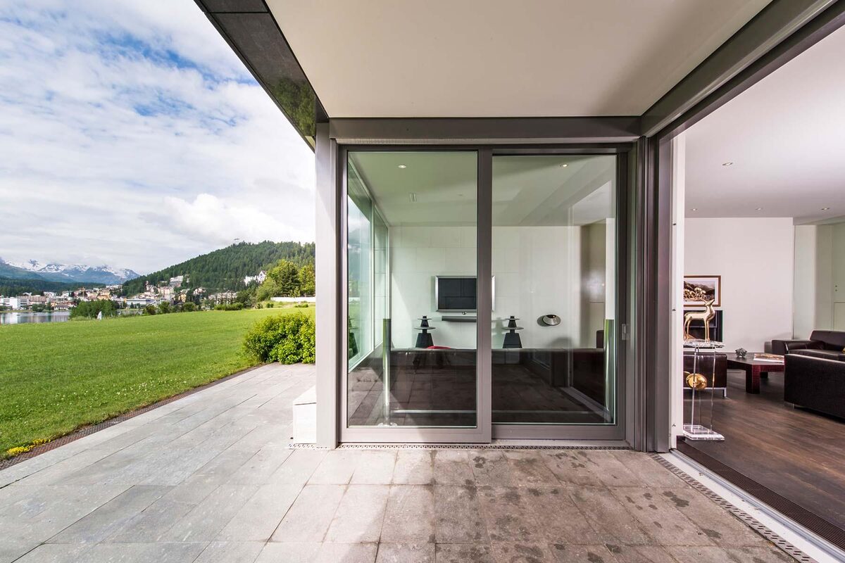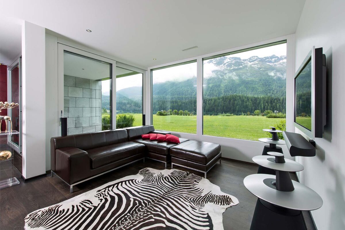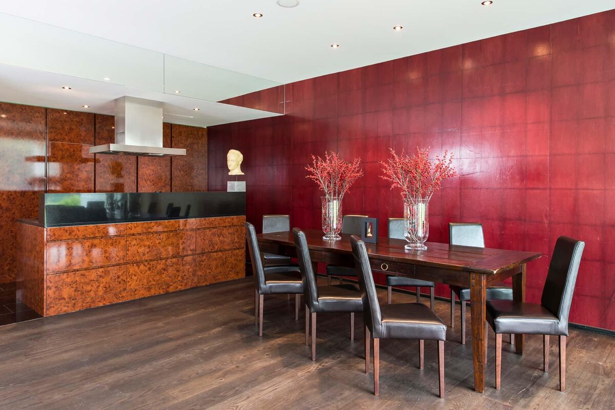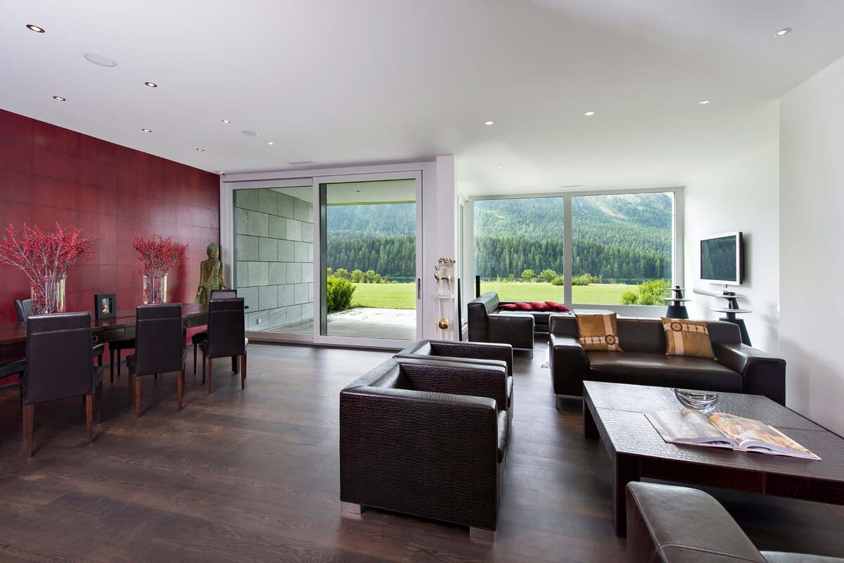 The interior of the apartment has a sophisticated Asian vibe and includes an open plan living and dining area. Sliding glass doors open onto a terrace with breathtaking views of the mountains and the lake. Relax in the TV corner or on the leather sofas beside the fireplace. There is a small kitchen with Nespresso machine.
