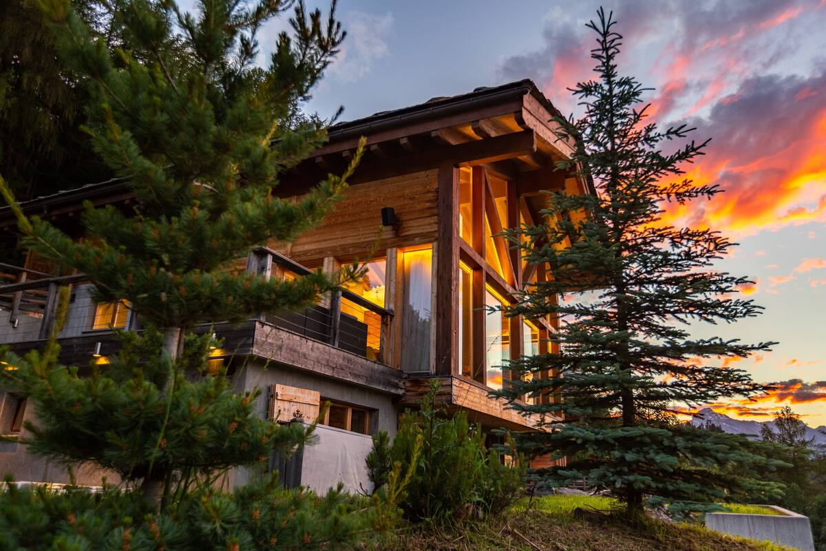 The luxury rental uses a mix of traditional and modern materials and building techniques with exposed concrete against traditional timbers. The chalet has large windows that create a frame around the panoramic views and let light stream into the property.