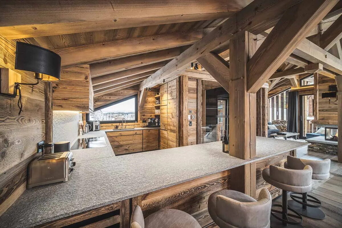 The main living area is open plan, light and spacious with a striking glass-sided fireplace at its centre. Here you can relax on comfortable sofas beside the fire, enjoy meals around the large dining table which seats 20 or enjoy an après-ski tipple or two at the bar whilst the chef in your group prepares a delicious meal in the well-equipped kitchen. You only have to step out onto the balcony to breathe in the mountain air and enjoy the views of your snowy surroundings.