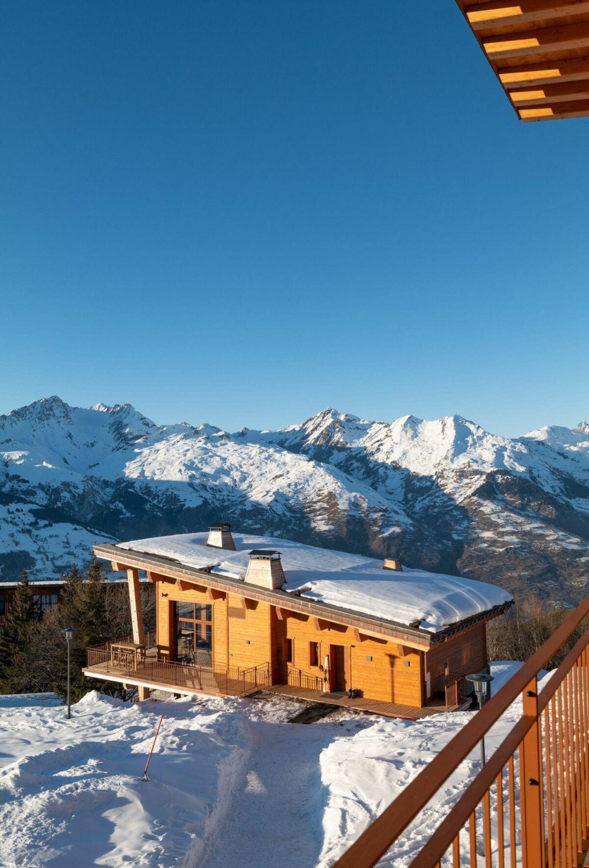 The living area occupies the top floor. Here you will see double height ceilings, which helps to create a wonderful open-plan space. A simple contemporary style gives the chalet a unique feel. The classy fireplace warms the room, allowing you to cuddle together on the cosy sofas, which are conveniently accompanied by a large flat-screen TV for you to escape. Make the most of this self-catered chalet and enjoy the freedom that the fully-equipped kitchen gives you. Indulge in each meal around the dining table, while a roomy breakfast bar in the centre of the kitchen is ideal for enjoying a few snacks and casual drinks during meal preparations. Double height ceilings on the top floor allows for some impressive floor to ceiling windows that frame some breath-taking views for you to feast on. An expansive balcony mirrors the living area and has several outdoor seating arrangements, so you can have a closer experience with the stunning views of Les Arcs.