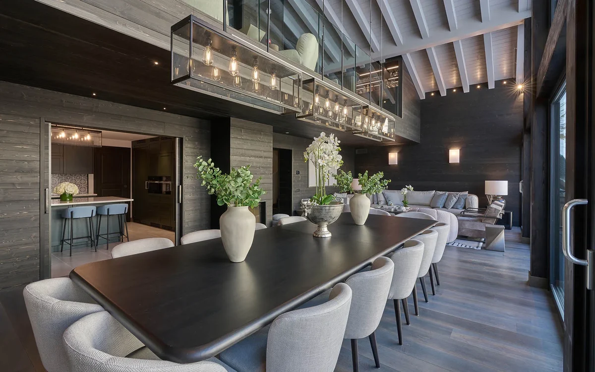The main living space is cathedral-esque in its design, with vaulted ceiling, mezzanine space overlooking the main room, and huge floor-to-ceiling windows framing the Matterhorn outside. A modern fireplace and sumptuous seating area provide space to relax after a day on the slopes, while a long, artisan wood table is the perfect backdrop to wonderful meals and fine wines, enjoyed with friends.