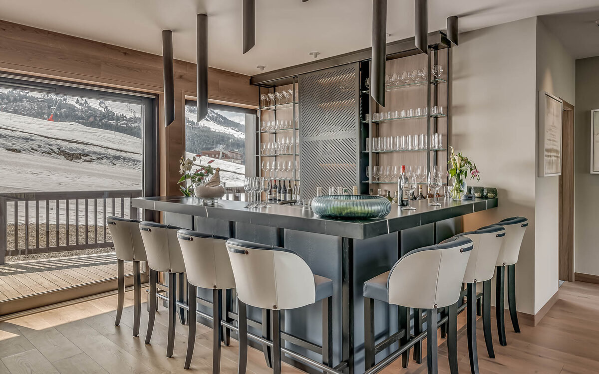 This is a fabulous place for gatherings, big and small, with a double-height living space complete with comfy curved sofas, laden with cushions and throws to cosy up in in the evenings. A feature fireplace separates this from the atmospherically lit modern dining area, where you’ll enjoy fabulous local dishes cooked by your private chef, alongside fine wines, and good conversation. And it’s never too far to walk for another bottle; a huge wine cellar is on display in the same room and there’s also a stylish bar, ideal for post-dinner drinks, just steps away. From here, floor-to-ceiling glass doors allow the light to flood in and they also slide back to allow access to the balcony and its outdoor hot tub overlooking the slopes and views of the mountain.
