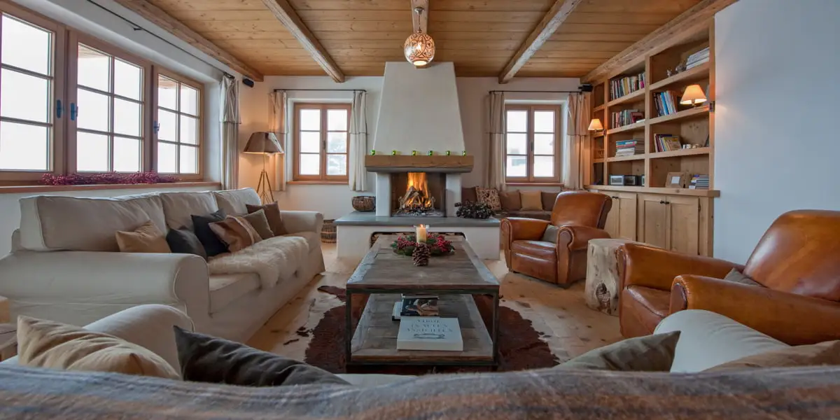 On the first floor are two double bedrooms with en-suite bathrooms and high exposed old wood beam ceilings, a feature throughout the chalet. The first of the doubles has its own fire place and a walk in wardrobe and both have access to the large balcony. There is a further double bedroom on this floor and the children’s room with 4 singles (2 bunk beds). The kids’ room has ample space and plenty of toys to keep the children happy. These two bedrooms share a large family bathroom across the hall with stunning Italian mosaic tiling.