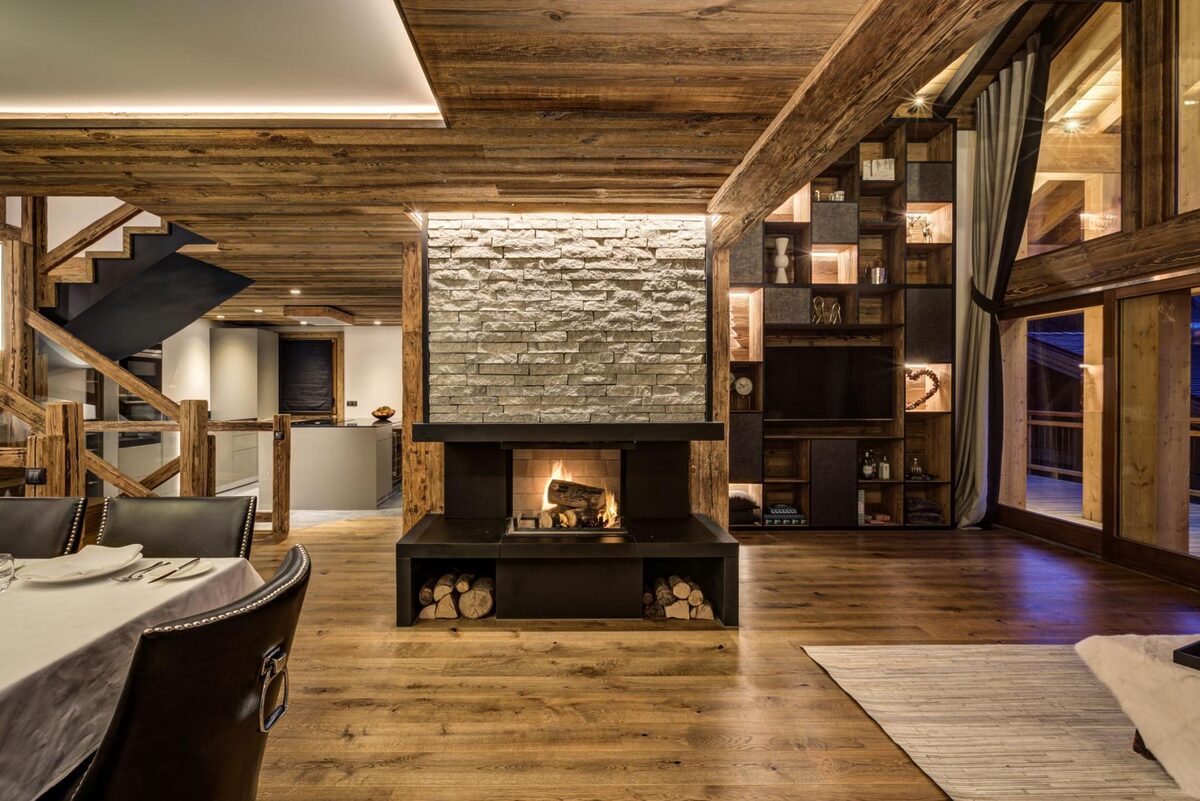 This contemporary chalet has kept true to its surroundings and offers a modern touch but with authentic Alpine charm. The living area is located on second floor and benefits from a lofty feel thanks to the high vaulted ceilings. With large windows the room is light and airy and the mountain views are drawn in to the cosy lounge space. There is a comfortable sofa corner and a central glass fronted fireplace to set the scene on a relaxing evening in. Flowing on from this space is the elegant dining area with ample seating for the whole group and the open-plan kitchen. The artisan gin bar has a unique selection of specialty gins and premium tonics for those who want to enjoy a refreshing G&T post-skiing.