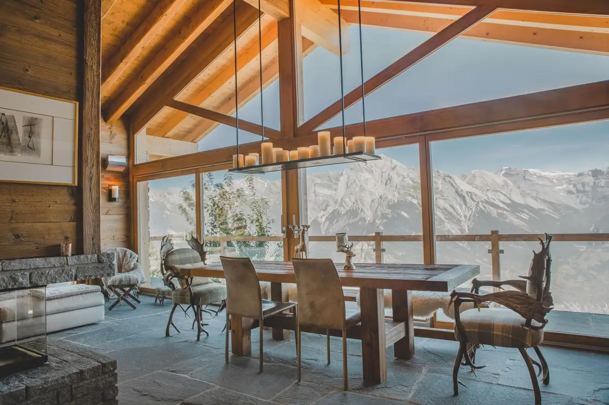 The property is a luxurious free-standing chalet which has been beautifully built and boasts spectacular views across the Rhone Valley. The chalet has been sympathetically constructed of local wood, stone and local materials, providing a traditional rustic feel, whilst combining a modern high-tech interior. Being generously spread over 3 floors, and offering 4 bedrooms and 4 bathrooms, it is ideal for a large group or two families.