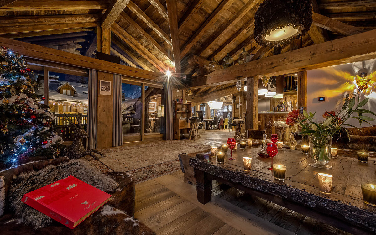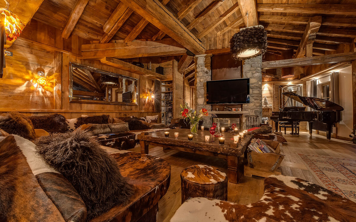 The chalet has a wonderful open plan living space which, complete with grand piano, dedicated bar area and funky animal hide sofas, makes a great space for socialising. The main living area opens out onto terraces and gives stunning views towards the infamous La Face piste.