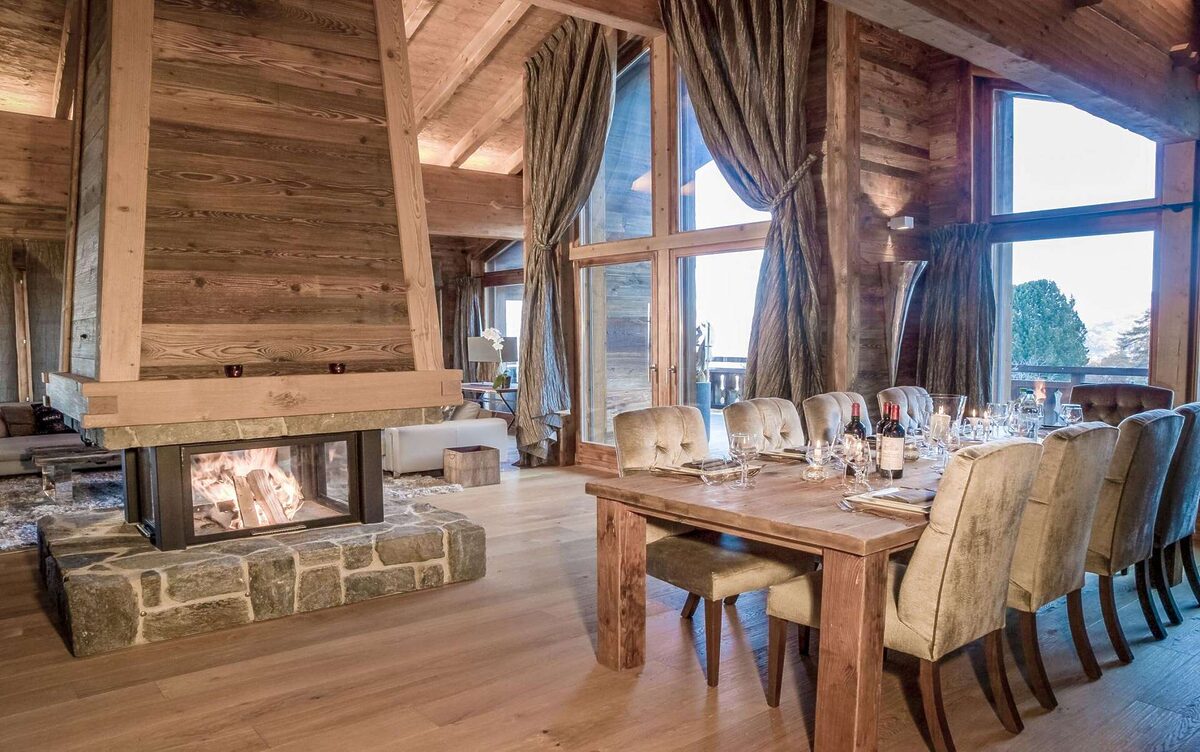 Fine volumes flooded with light, elegant decor loaded with noble materials: touches of leather, fur and warm fabrics. The heart of this luxury chalet comprises a large lounge with exposed beams, a beautiful fireplace and wood corner office. The adjacent dining room – that opens onto a large terrace – contributes to the ease of meals with family or friends.