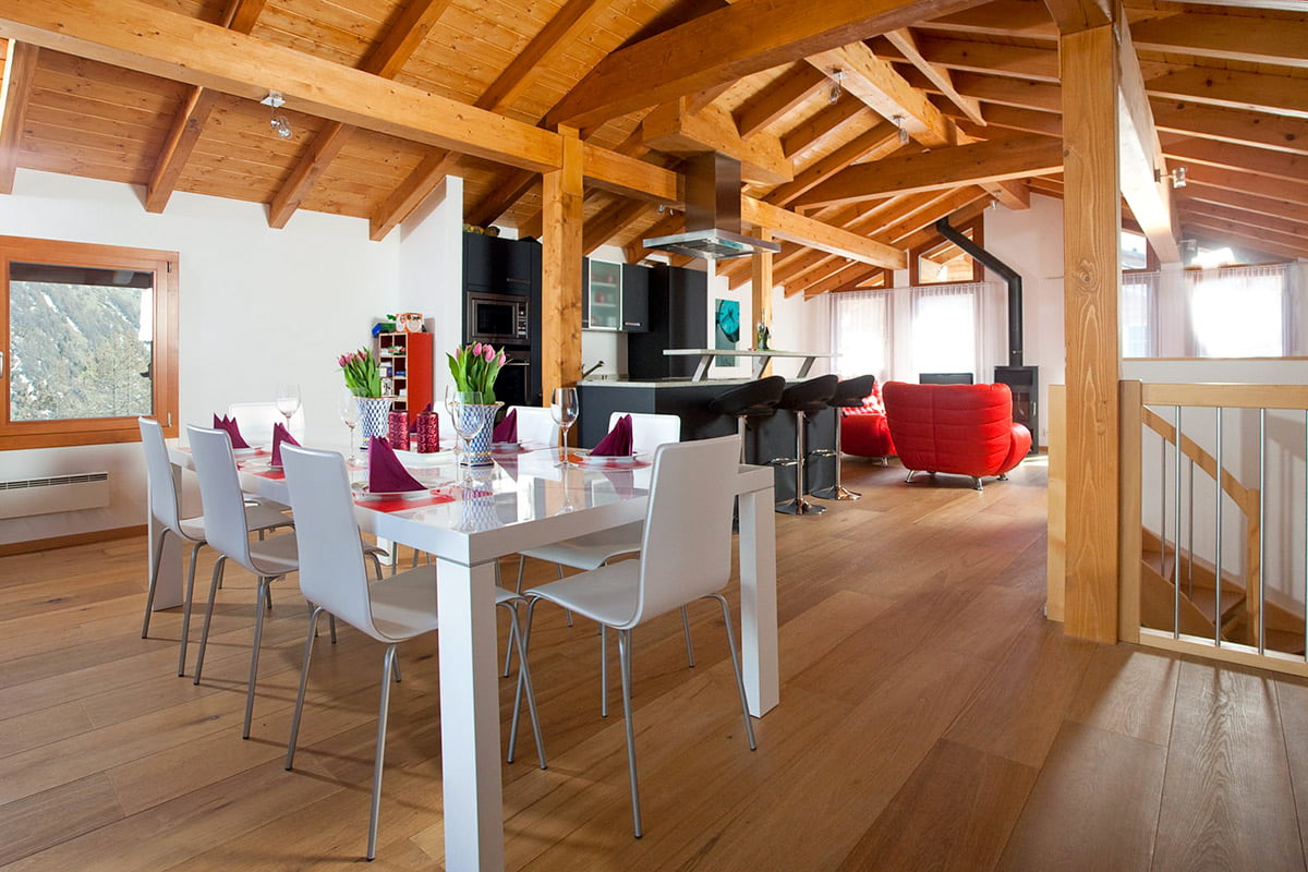 The spacious 3-floor chalet is decorated in a contemporary style, with an abundance of natural light, enhanced on the top level by the “cathedral”-style raised ceiling and large windows. The main living area benefits from a wood-burning fireplace – just what’s needed for a cozy winter’s evening. The modern kitchen is well equipped for entertaining, with granite countertops and island seating, next to the mountain-view dining area.