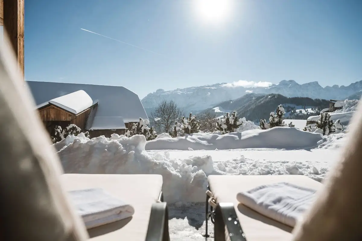 The chalet has a dedicated wellness area with a luxurious relaxation room, a steam room, dry sauna and outdoor hot tub with incredible mountain views.