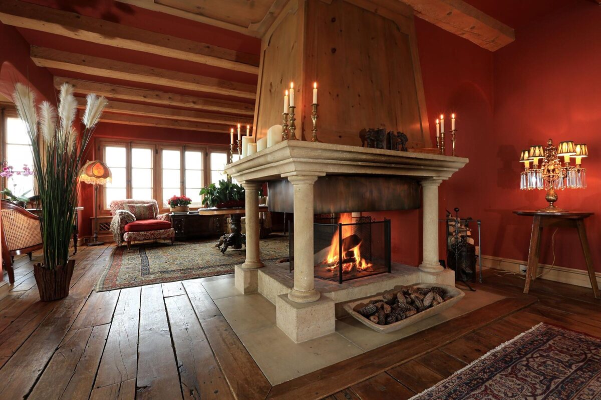 Level one also has a club / office room with deep cosy sofas and a large antique desk. To the side of this is yet another terrace where guests can relax in complete privacy. Finally, there’s a traditional Swiss kitchen or secondary dining area with a wood oven that can be used for indoor barbecues and preparing local delicacies.