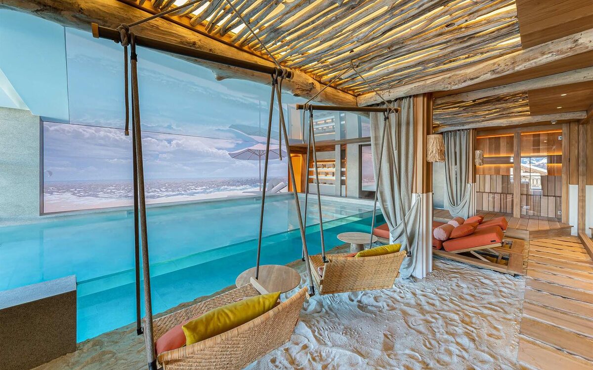 On the lower floors you’ll find chalet’s spacious ski room, and the wellness area, a true pièce de résistance. Featuring an indoor/outdoor swimming pool, driftwood ceilings, swing seats, all against the backdrop of murals depicting Saint-Tropez’s Pampelonne bay, it’s as if you’ve been transported to the Mediterranean. There’s also a sauna, Hammam, gym, and massage room dedicated to post-ski relaxation.