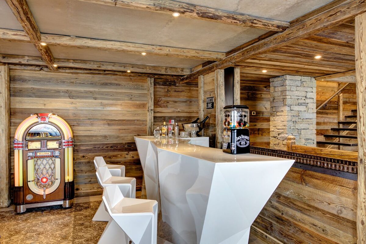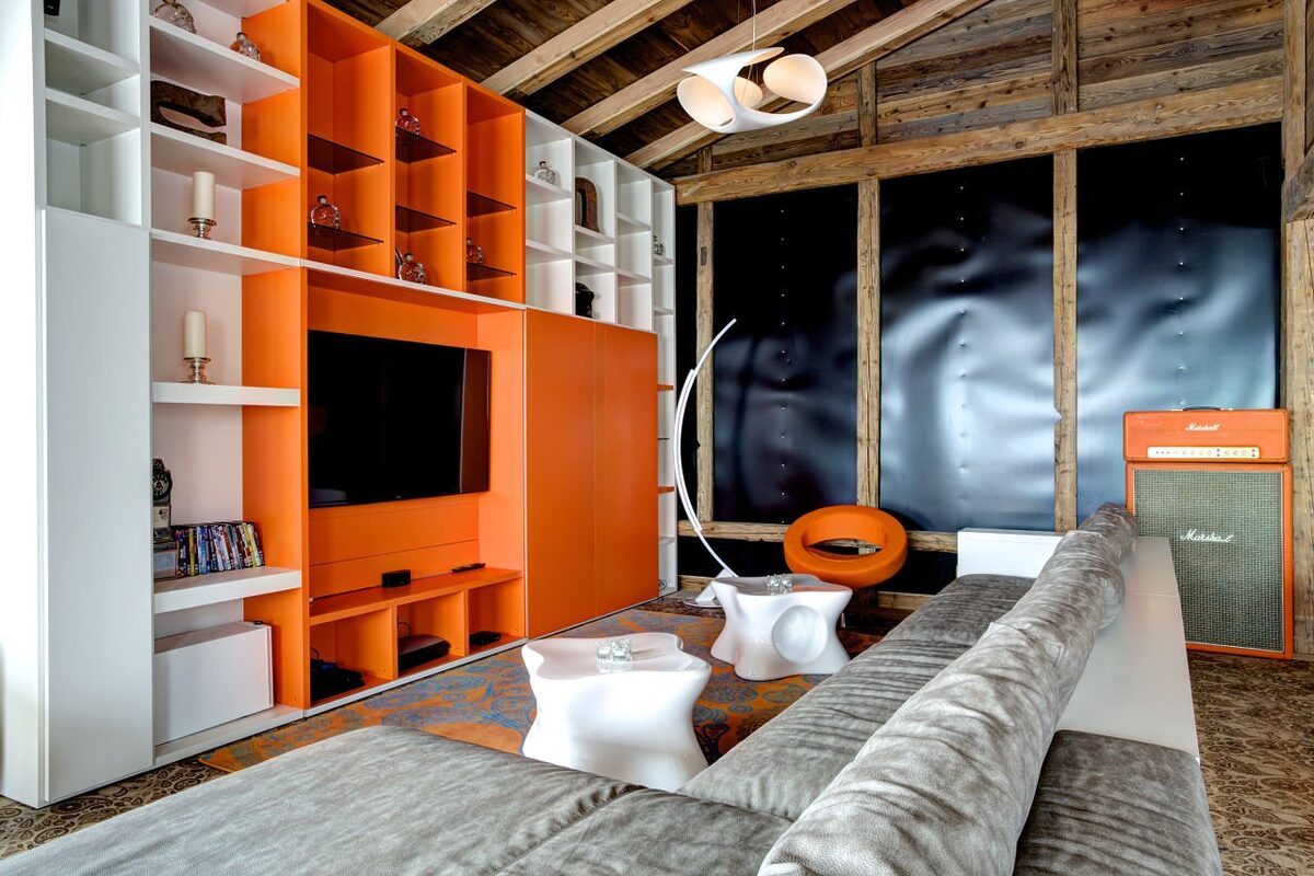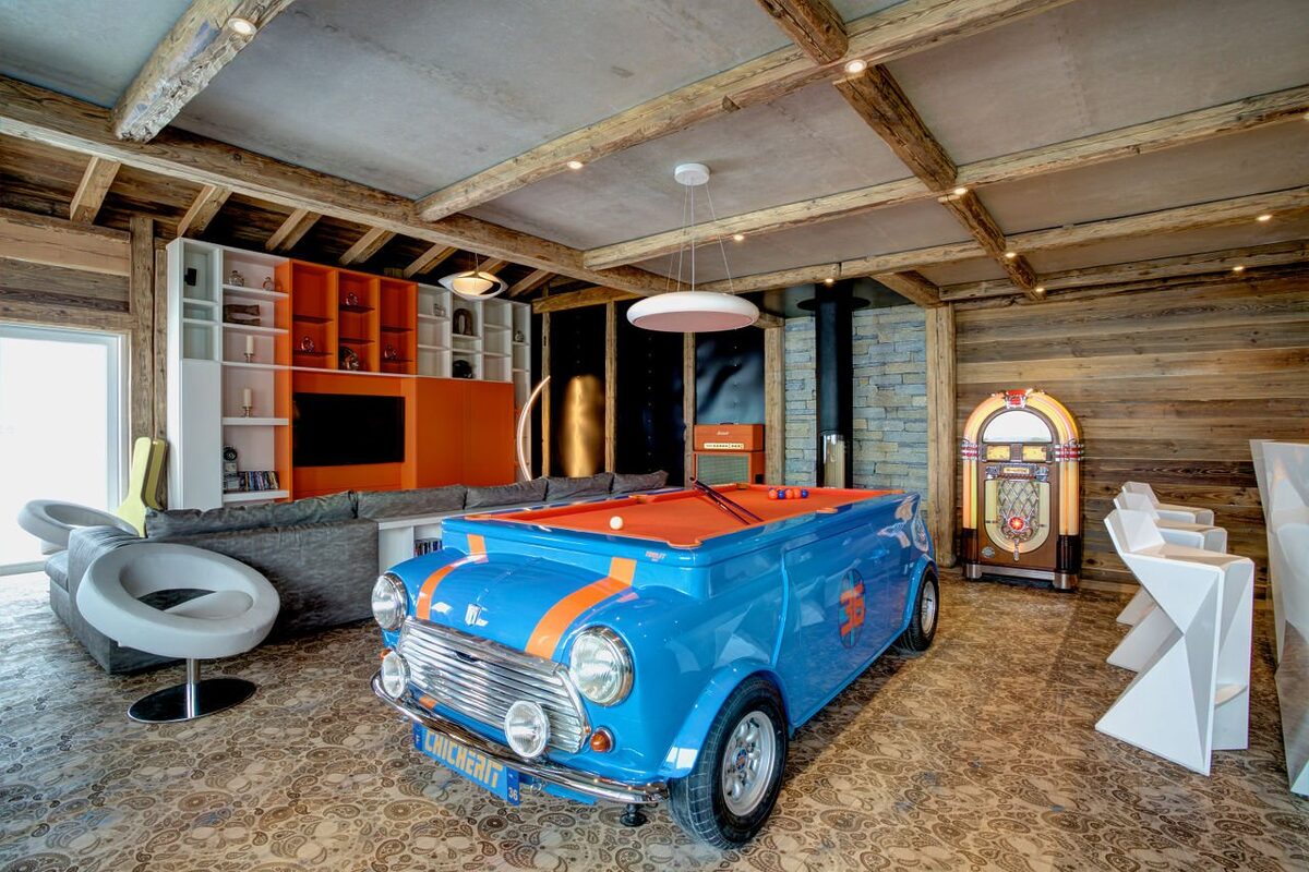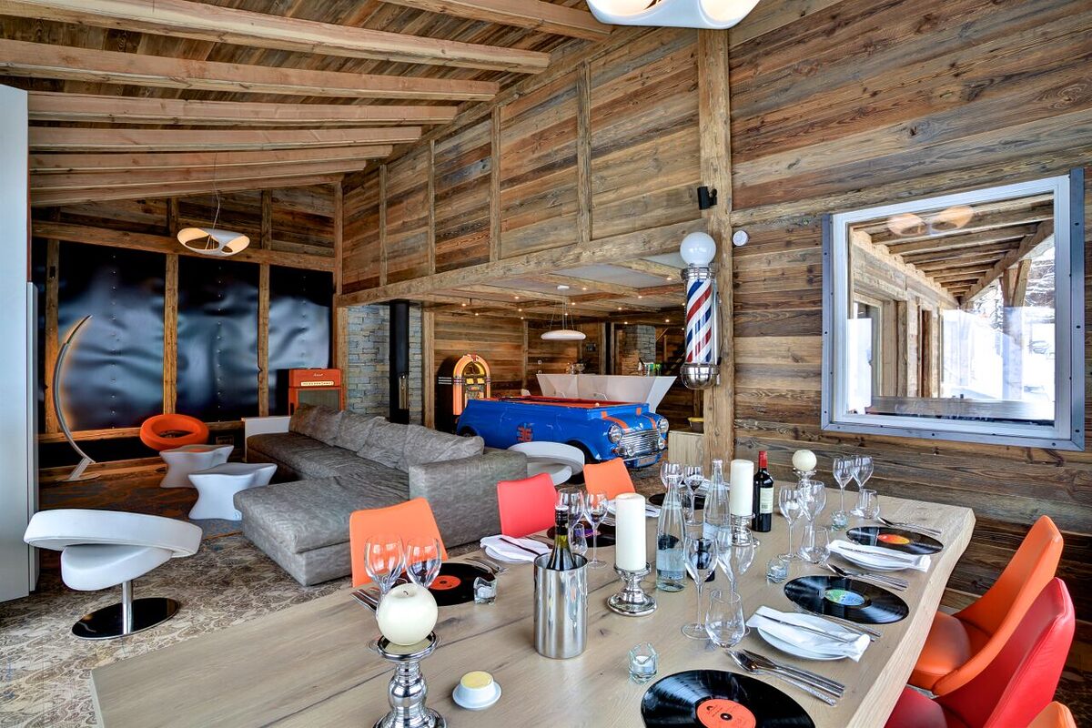 Located in the traditional village of Tignes les Brevieres, just a short walk from the ski lifts and village restaurants, the chalet can accommodate up to eight adults and seven children in 430m² of living space. The exterior of the property is traditional, but inside it’s a different story with 70’s inspired furnishings in eye-popping colours, Route 66 memorabilia and a number of quirky features and grown up toys to keep adults and children alike entertained.