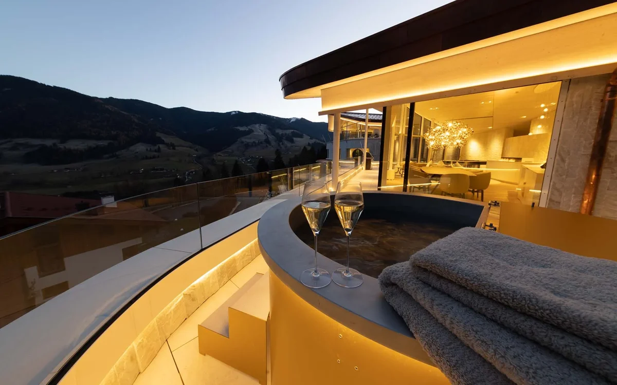 Perched high up on the mountain, its Alpine marble exterior shimmering in the sunshine, the chalet has more than a little star quality. This luxury ski chalet in Leogang can host up to 20 people* across its two interconnecting chalets and is truly one of a kind.
