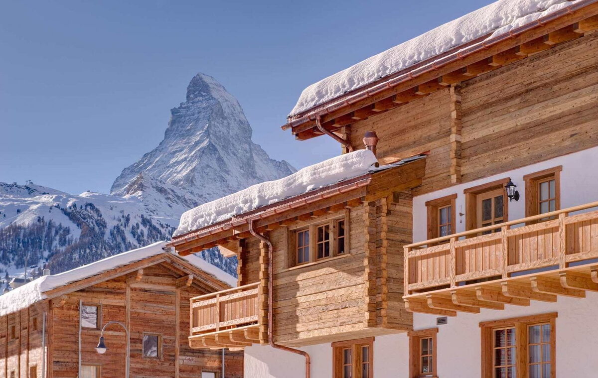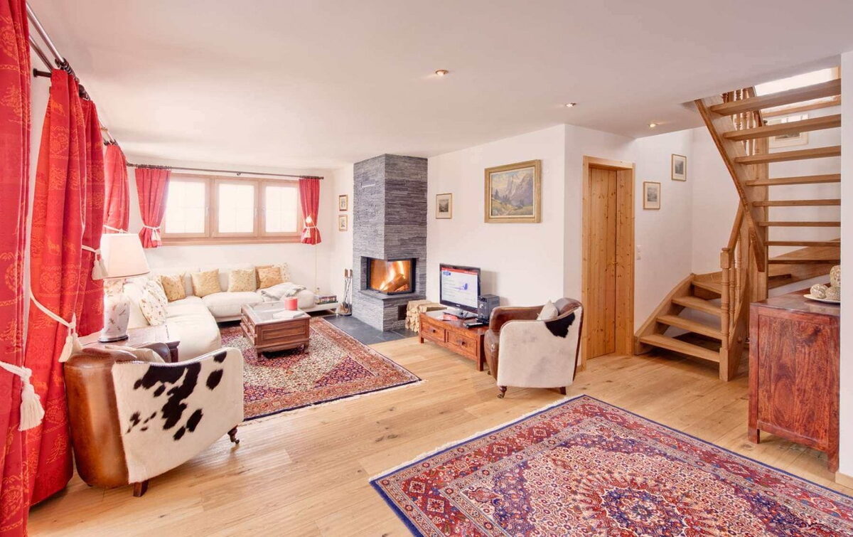 Built in typical Alpine style, the chalet combines classic Swiss architecture with contemporary features and furnishings. The entrance hall on the first floor leads into an open plan living and dining area with fireplace, sofas, armchairs and a teak dining table. There is also a modern and well-equipped kitchen. Doors open onto a balcony with magnificent Matterhorn views.