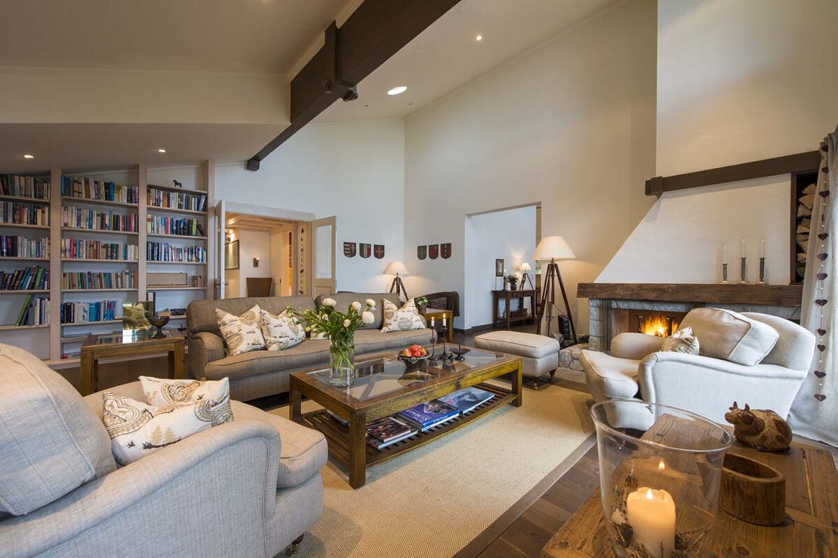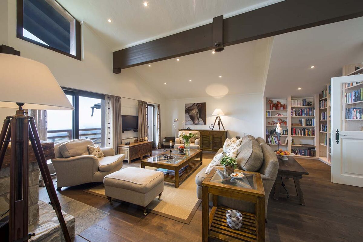 A flight of stairs leads into a welcoming entrance hall, furnished with an aviator-style armchair. There is a large storage area with heated boot warmers and plenty of hanging space for jackets and ski equipment. The entrance leads into a delightful living area with, bookshelves and huge windows flooding the room with natural light. Here you can relax on sofas in front of the fireplace and TV before heading out onto the balcony to take in the fresh mountain air and valley views.
